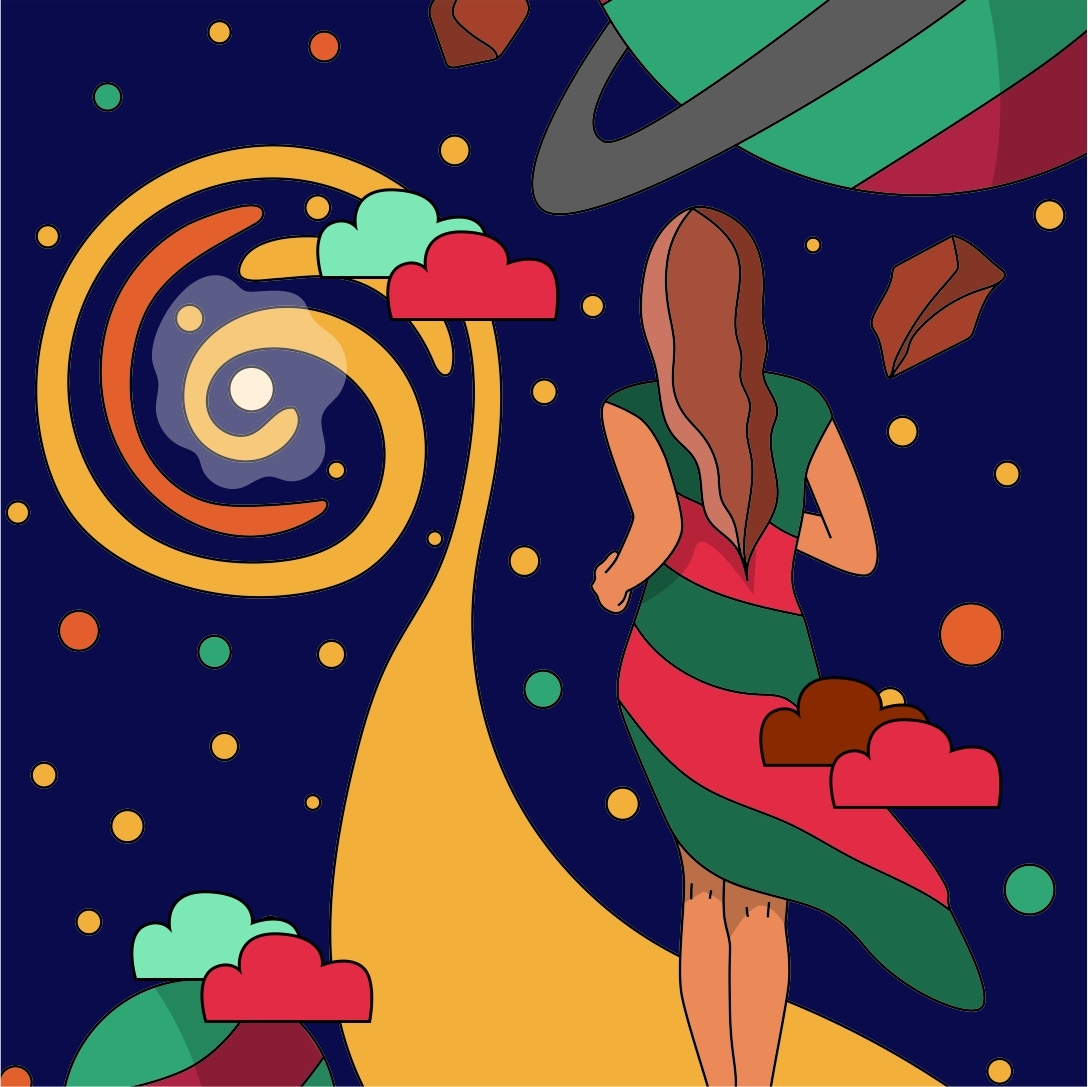 Девушка бежит по энергетической дороге к черной дыре, которая трансформирует и создает энергию. Вместо планет - резиновые мячи, как пустые ценности, мимо которых бежит девушка к своей цели. Они способны были только забирать ее время и энергию, и не давали увидеть в себе творца.