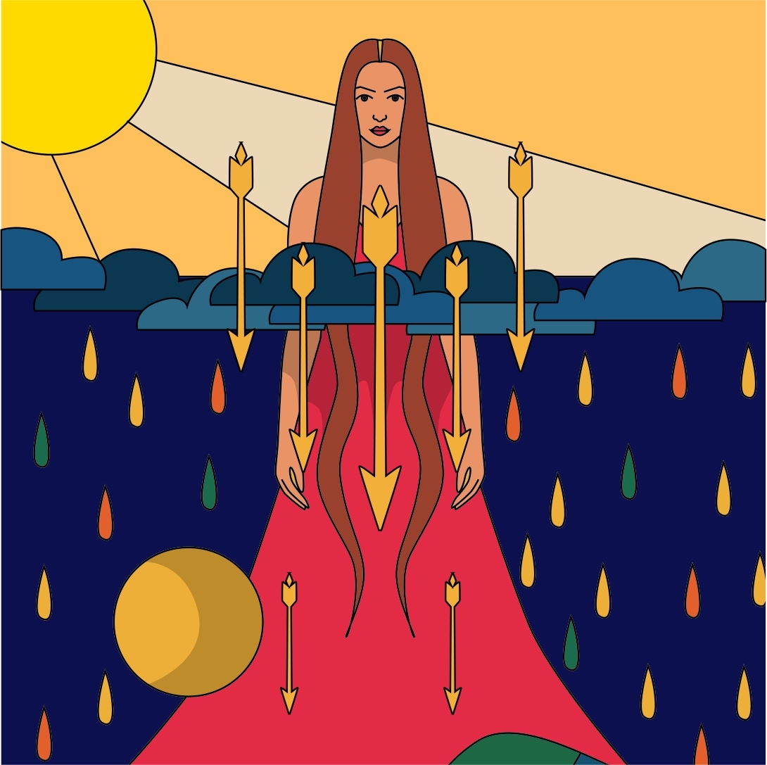 Человек выше облаков символизирует, что он научился получать эмоции естественным путем. Стрелы - это раздражение, которое он уже не использует, он вырос и стал выше этого состояния.