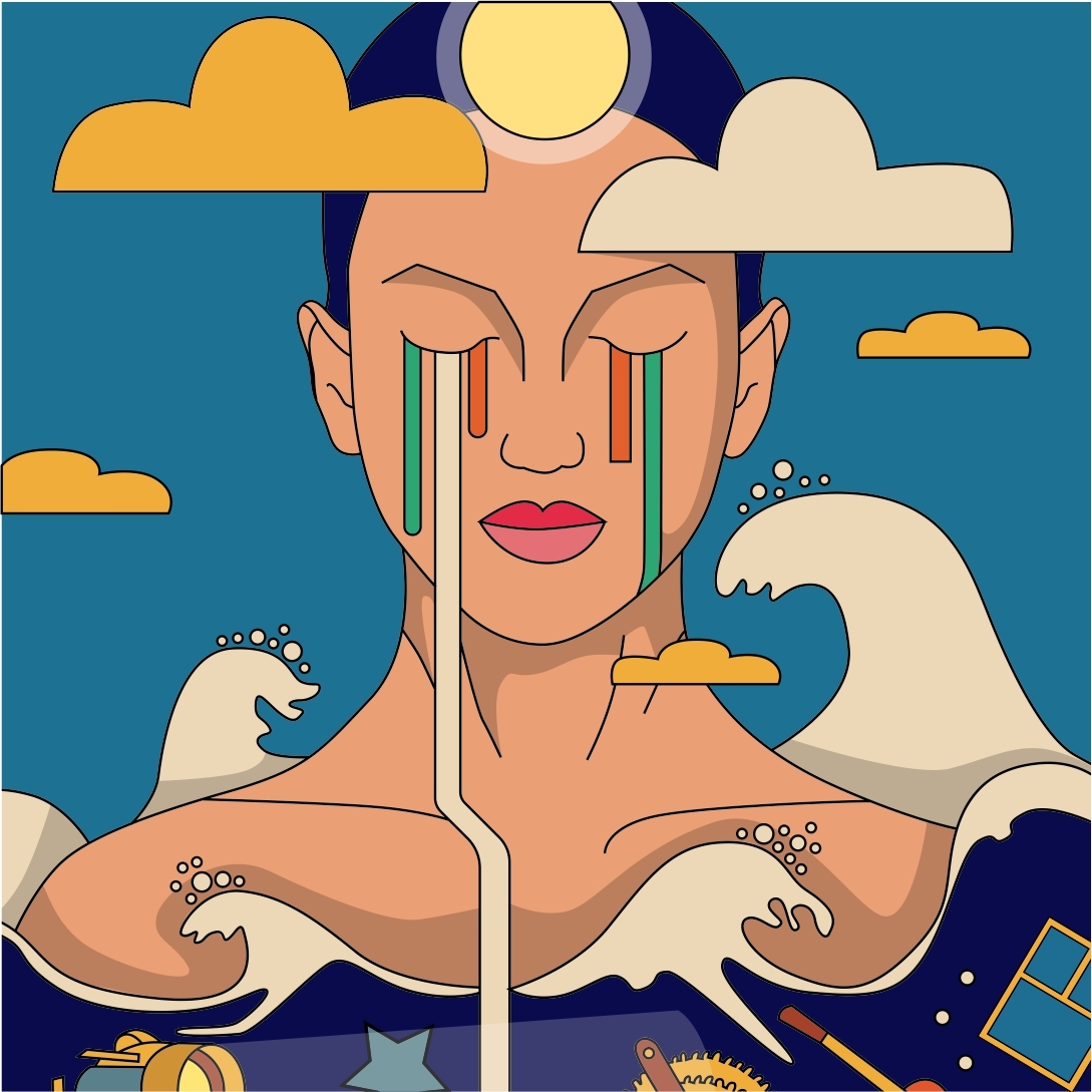 Слезы – это избавление от всего ненужного, отягощающего и в этом море слез тонет все лишнее. Солнце на уровне лба – это умение сконцентрироваться на нужном.