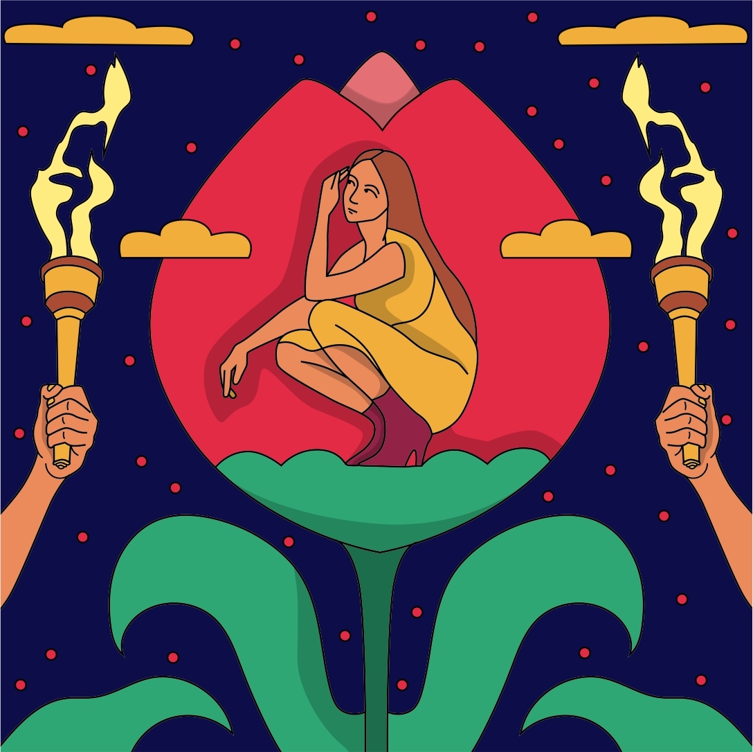 Человек стеснен в выражении себя, но бутон показывает, что есть возможность открыться и проявить себя. Руки с факелами подсвечивают проблему. Планета, за которую корнями держится цветок - символизирует раскрытие внутреннего мира.