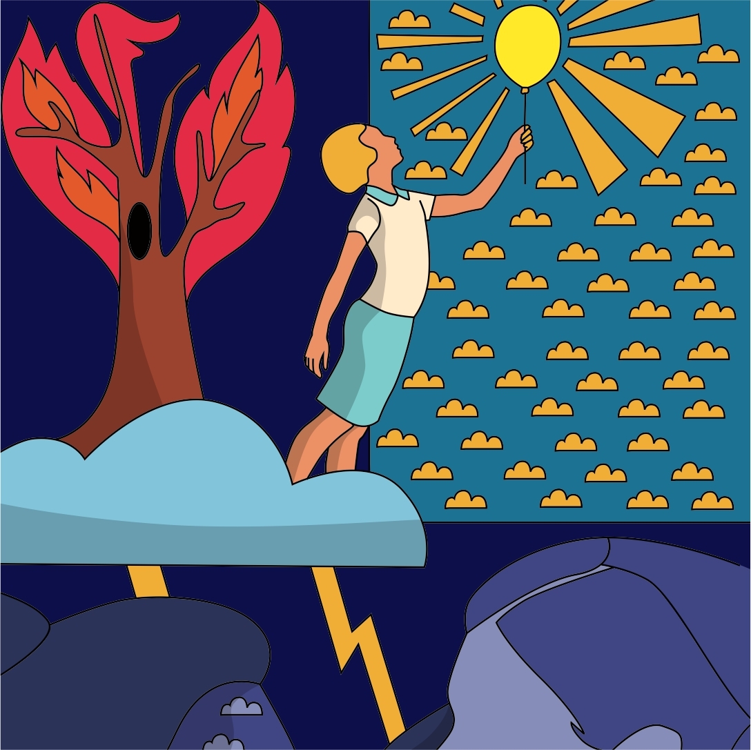 Человек поднимается вверх, позволяя себе быть свободным от мнения окружающих, и даже в чем-то неудобным для других. Он держит желтый шарик, который одновременно символизирует солнце и одобрение самим человеком своего выбора. Этот шарик-солнце освещает реальность человека и открывает дверь в новую легкую жизнь. Засыхающее дерево - как предыдущий, ущербный образ мысли. Люди внизу в темноте - это толпа, которая недовольна собой. Но вместо того чтобы заниматься своей жизнью эти люди осуждают других.
